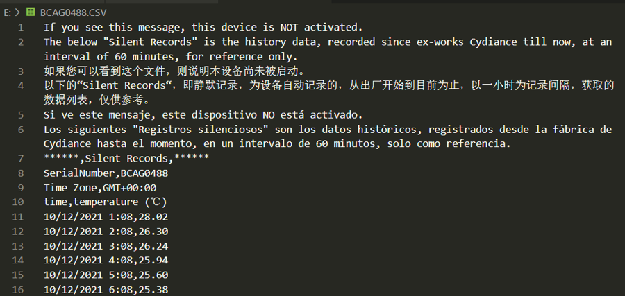 If the device is connected to the computer via USB before activation, it will generate a "Silent Records" report (CSV format), showing all stored temperature data and indicating that the report is a silent recording report;